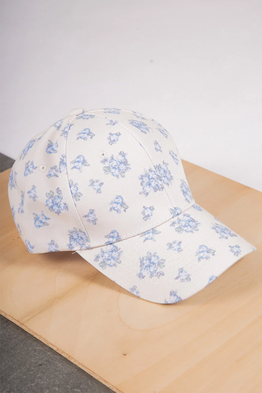 Casquette pour femme avec imprimé de petits bouquets de fleurs bleues. La coupe décontractée et la sangle réglable de cette casquette assurent une expérience de port confortable.