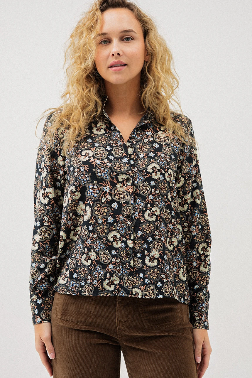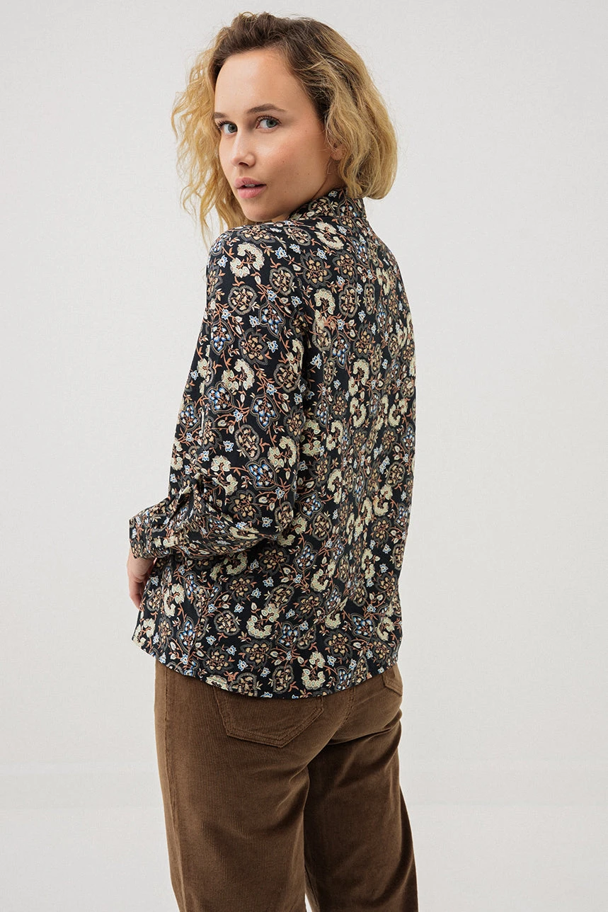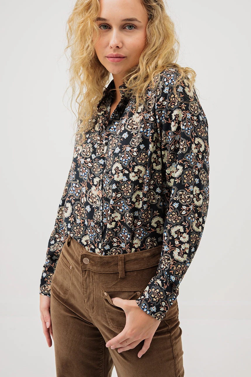 La blouse à motif fleuri inspiré paisley allie élégance et confort dans un style intemporel. Conçue dans une coupe droite, elle épouse la silhouette avec naturel sans la contraindre. Son col chemisier et sa boutonnière pleine longueur apportent une touche classique et raffinée, tandis que ses manches longues, dotées d’une fente et d’un bouton au poignet, ajoutent une finition soignée. Son ourlet droit et sa matière légère et confortable en font une pièce idéale pour le quotidien comme pour les occasions plus habillées, tout en offrant une allure féminine et délicatement travaillée.