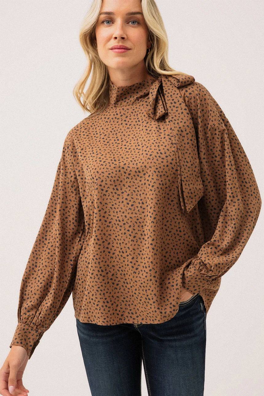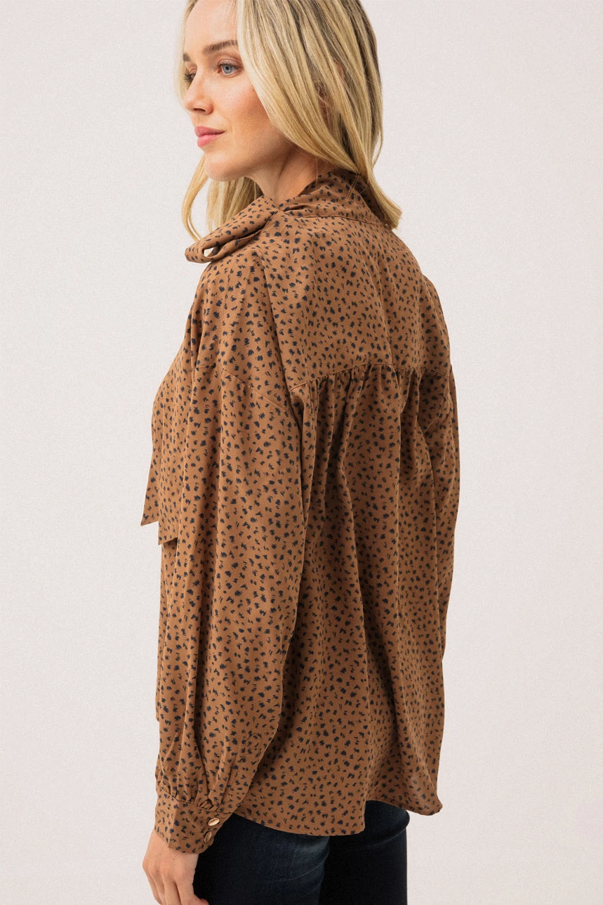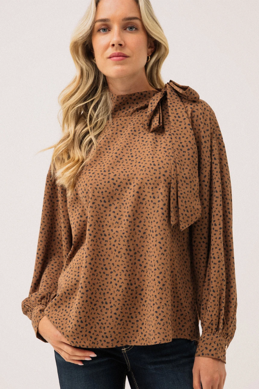 La blouse avec nœud au col à l’épaule gauche se distingue par son élégance raffinée et ses détails délicats. Sa coupe ample lui confère une belle fluidité et un tombé naturel, tandis que le col Lavallière, noué avec grâce sur l’épaule gauche, ajoute une touche féminine et sophistiquée. Le dos est souligné par un empiècement avec fronces, offrant un confort et un volume subtil. Les manches longues de style Bishop, terminées par des poignets avec fente à plaquette et boutons, apportent une allure chic et structurée. L’ourlet arrondi vient parfaire la pièce, idéale pour être portée aussi bien rentrée dans un pantalon chic qu’avec une jupe fluide.