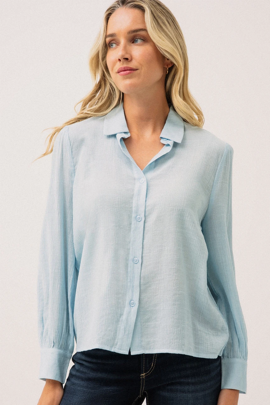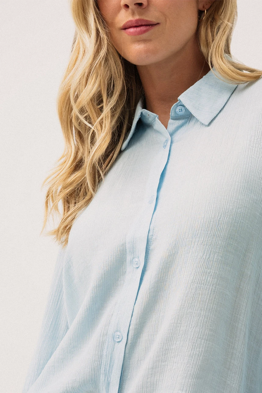 La chemise effet plissée bleue combine élégance et confort grâce à sa coupe droite légèrement ample qui assure un tombé fluide et moderne. Son col chemisier classique et sa boutonnière pleine longueur lui confèrent un style intemporel, parfait aussi bien pour le bureau que pour un look décontracté chic. Les manches longues se terminent par des poignets avec fente et bouton, apportant une finition soignée et pratique. Son ourlet droit et sa matière légère et confortable en font une pièce agréable à porter toute la journée, tout en restant polyvalente et raffinée.