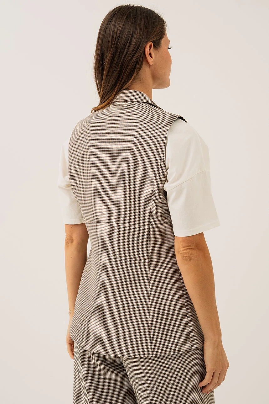 La veste habillée pied de poule brune présente une coupe près du corps qui met en valeur la silhouette, avec un col cranté classique et deux poches passepoilées à l’avant pour une touche élégante. Son ourlet droit et sa longueur sous la taille lui confèrent un style structuré et raffiné, tandis que le port ouvert apporte un aspect moderne et décontracté, idéal pour compléter une tenue chic et contemporaine.