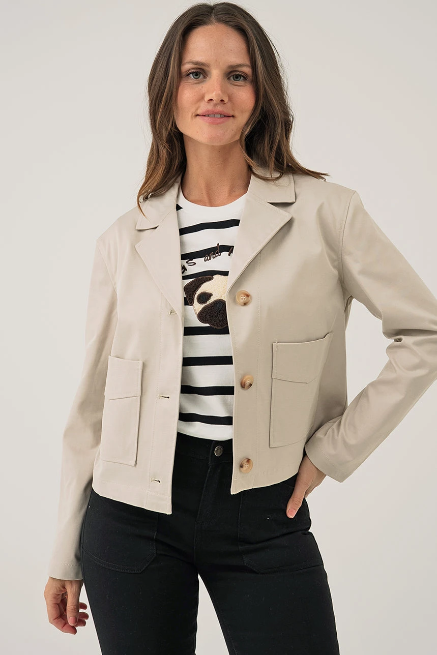 Le blazer court léger présente une coupe droite légèrement ample qui lui confère une allure moderne et décontractée. Doté d’un col à revers et de manches longues, il se distingue par ses deux poches appliquées à l’avant, pratiques et stylées. Confectionné dans une matière douce et confortable, il se porte facilement au bureau comme en sortie, ajoutant une touche chic sans effort à vos tenues.