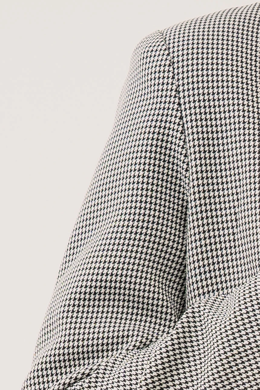 Le blazer en pied de poule noir présente une coupe ample offrant confort et liberté de mouvement. Il est doté d’un revers de col cranté classique, de manches longues avec fentes et boutons décoratifs, ainsi que de deux fausses poches passepoilées à l’avant pour un look soigné. La doublure au corps et aux manches assure un porté agréable, tandis que les plis d’aisance à l’arrière ajoutent une touche de sophistication et facilitent le mouvement.