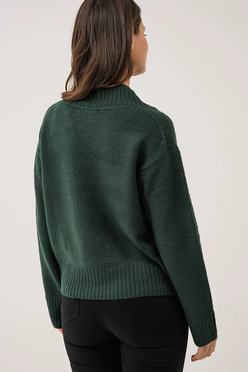 Le chandail en tricot vert forêt offre une coupe ample qui allie confort et style décontracté. Son col en V met subtilement le cou en valeur, tandis que les bordures côtelées ajoutent une touche de texture et de structure. Confectionné dans un tricot doux, extensible et confortable, il est parfait pour les journées fraîches où l’on recherche à la fois chaleur et élégance naturelle.