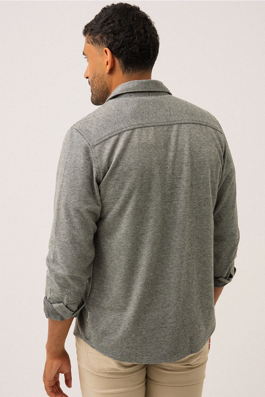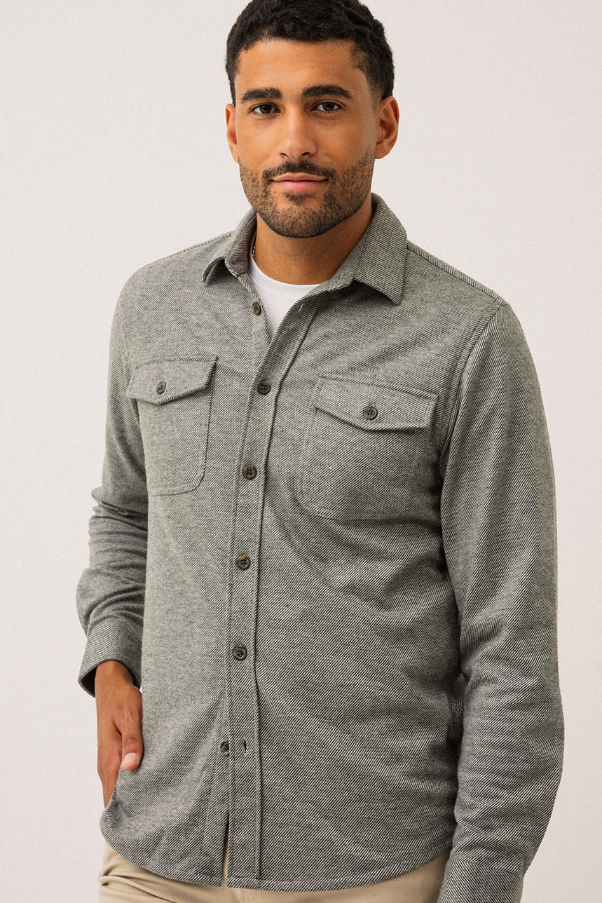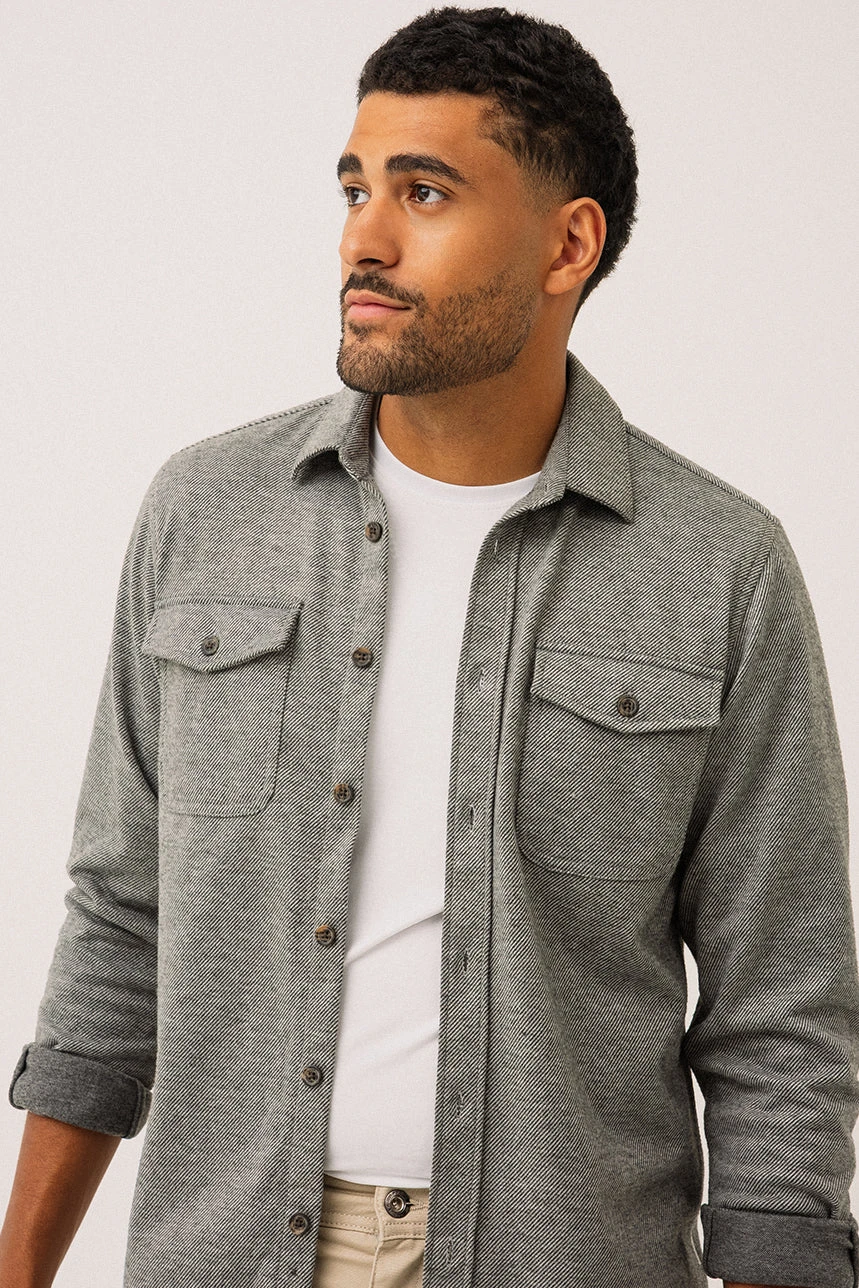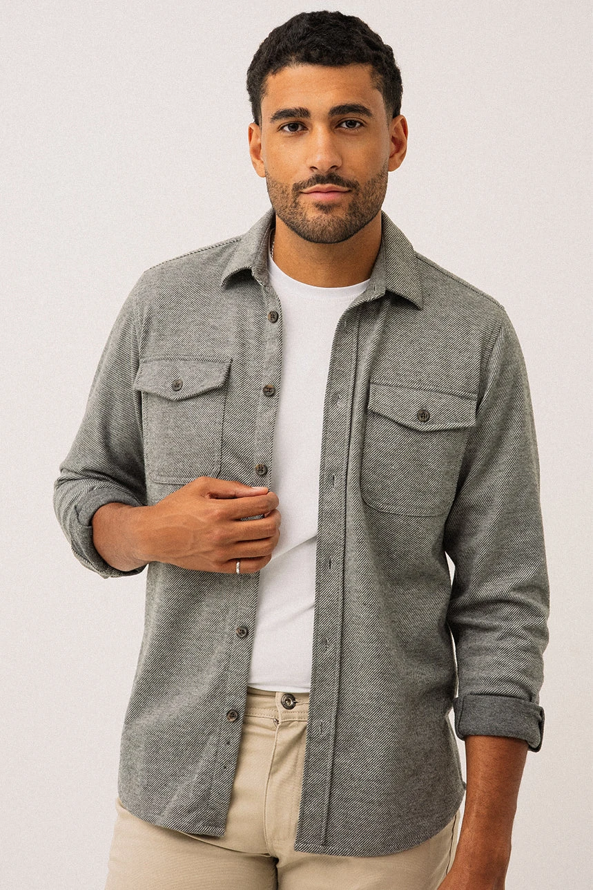 La chemise en tricot jersey à texture flanelle grise présente une coupe droite offrant un tombé naturel et confortable. Elle est dotée d’un col chemisier classique et d’une boutonnière pleine longueur pour un style polyvalent. Les manches longues se terminent par des poignets à revers en tissu contrastant avec ouverture boutonnée, ajoutant une touche raffinée. Deux poches appliquées à rabat à la poitrine apportent une allure utilitaire. L’ourlet légèrement arrondi et la petite étiquette à la couture latérale gauche, placée à 2 pouces de l’ourlet, complètent les détails soignés. Confectionnée dans un tissu doux et extensible, cette chemise combine confort et élégance décontractée.
