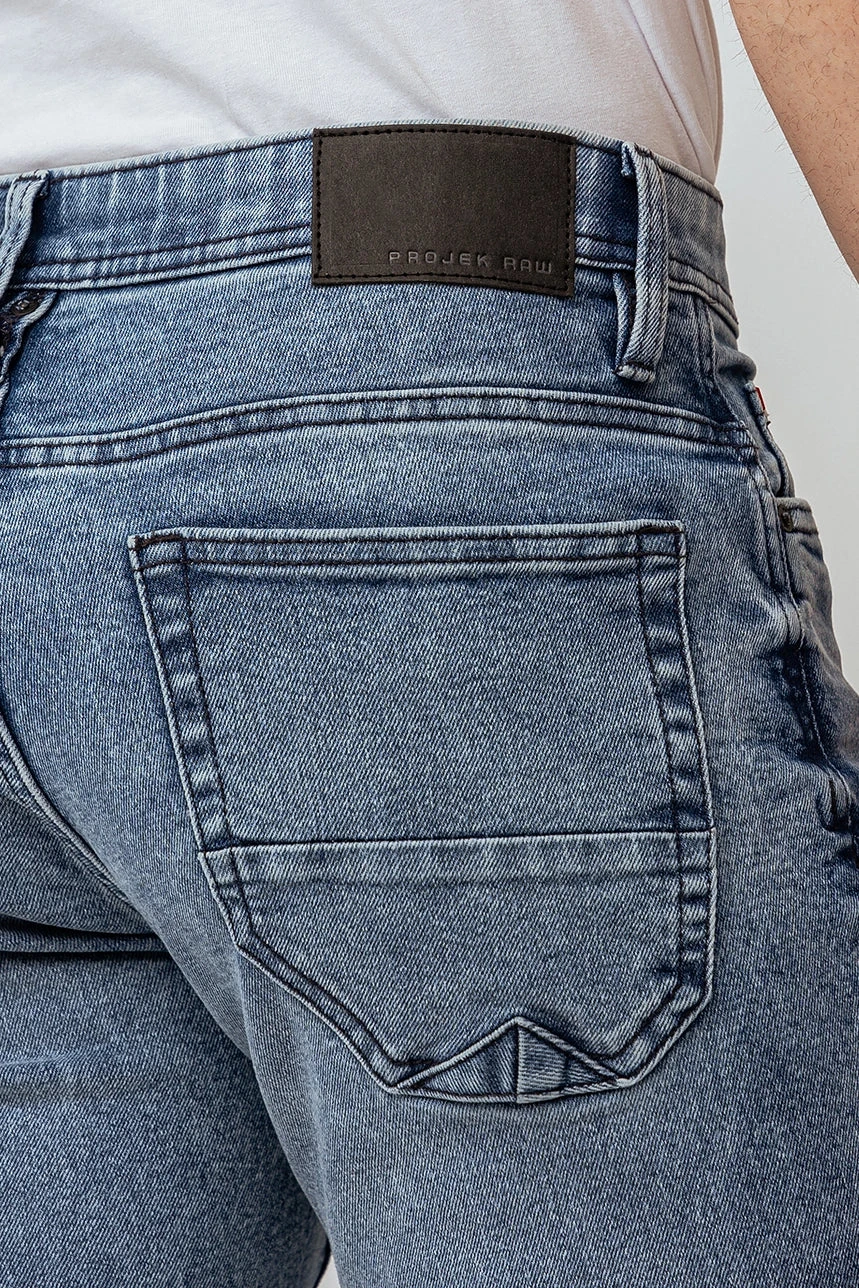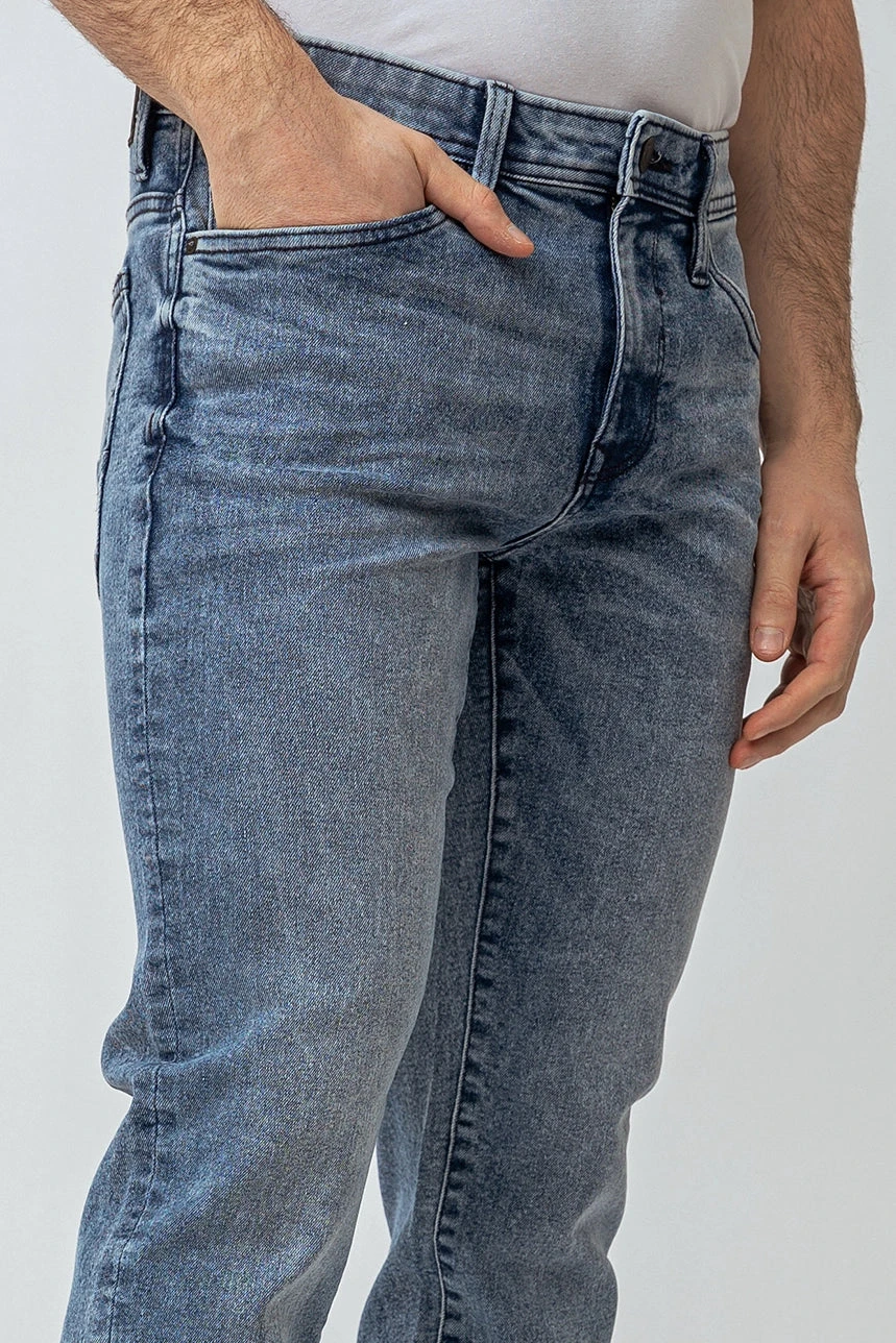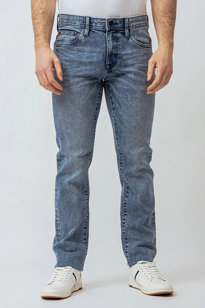 Adoptez un style décontracté avec le jeans droit délavé | Modèle Baru. Sa taille régulière, sa jambe droite et son denim délavé extensible offrent un ajustement confortable et un look intemporel. La bande de taille élastique assure un maintien optimal, parfait pour un confort au quotidien.