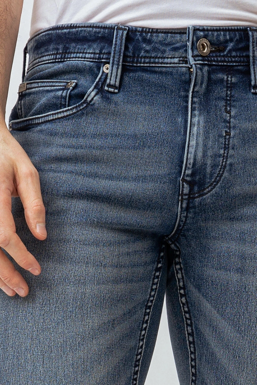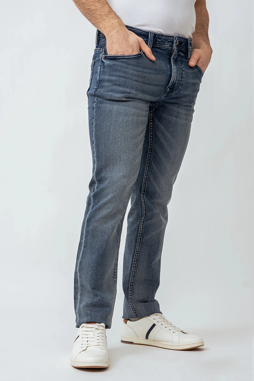 Adoptez un style décontracté avec le jeans droit délavé | Modèle Baru. Sa taille régulière, sa jambe droite et son denim délavé extensible offrent un ajustement confortable et un look intemporel. La bande de taille élastique assure un maintien optimal, parfait pour un confort au quotidien.