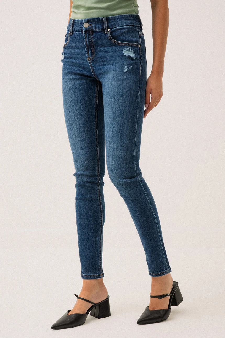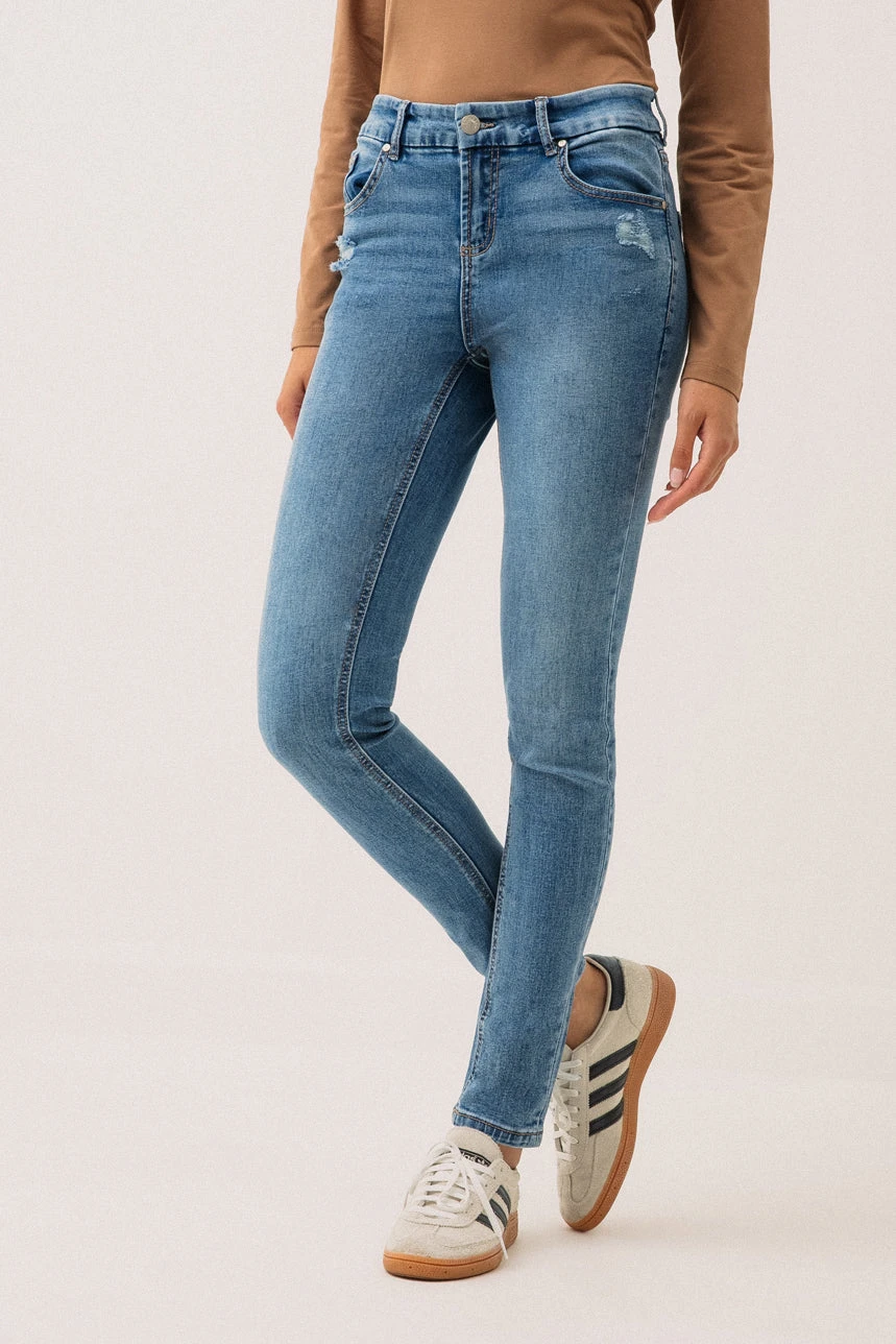 Le jeans Sophia affiche une coupe ajustée et une jambe étroite qui allongent la silhouette. Sa taille régulière et son pantalon 5 poches conservent le style denim classique, agrémenté d’un détail d’usure subtil aux poches pour une touche décontractée. Il est doté d’une fermeture éclair avec bouton à l’avant et de 5 passants de ceinture pour un ajustement parfait. Conçu dans un denim doux et extensible, il allie confort et style pour un usage quotidien.