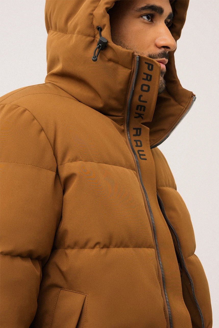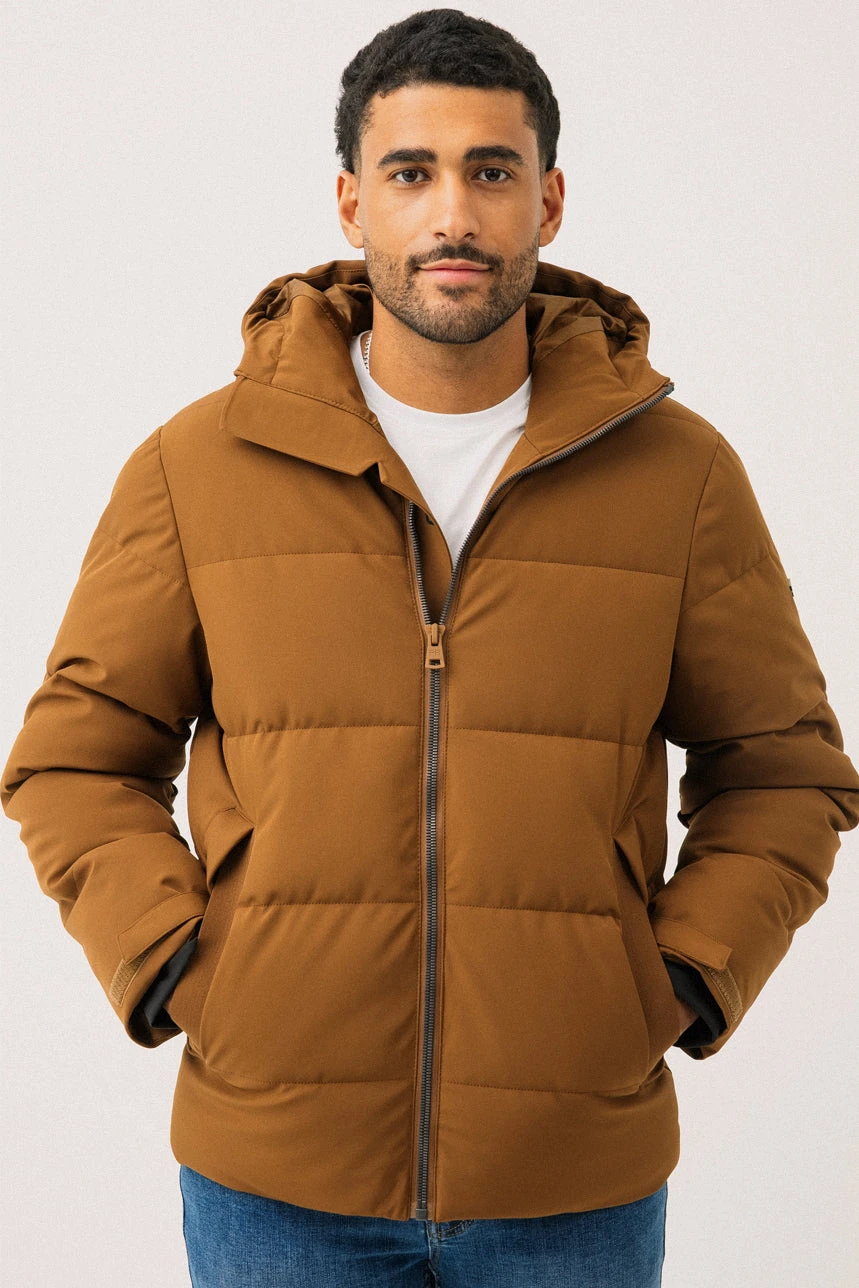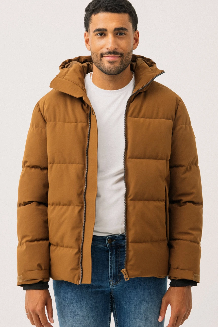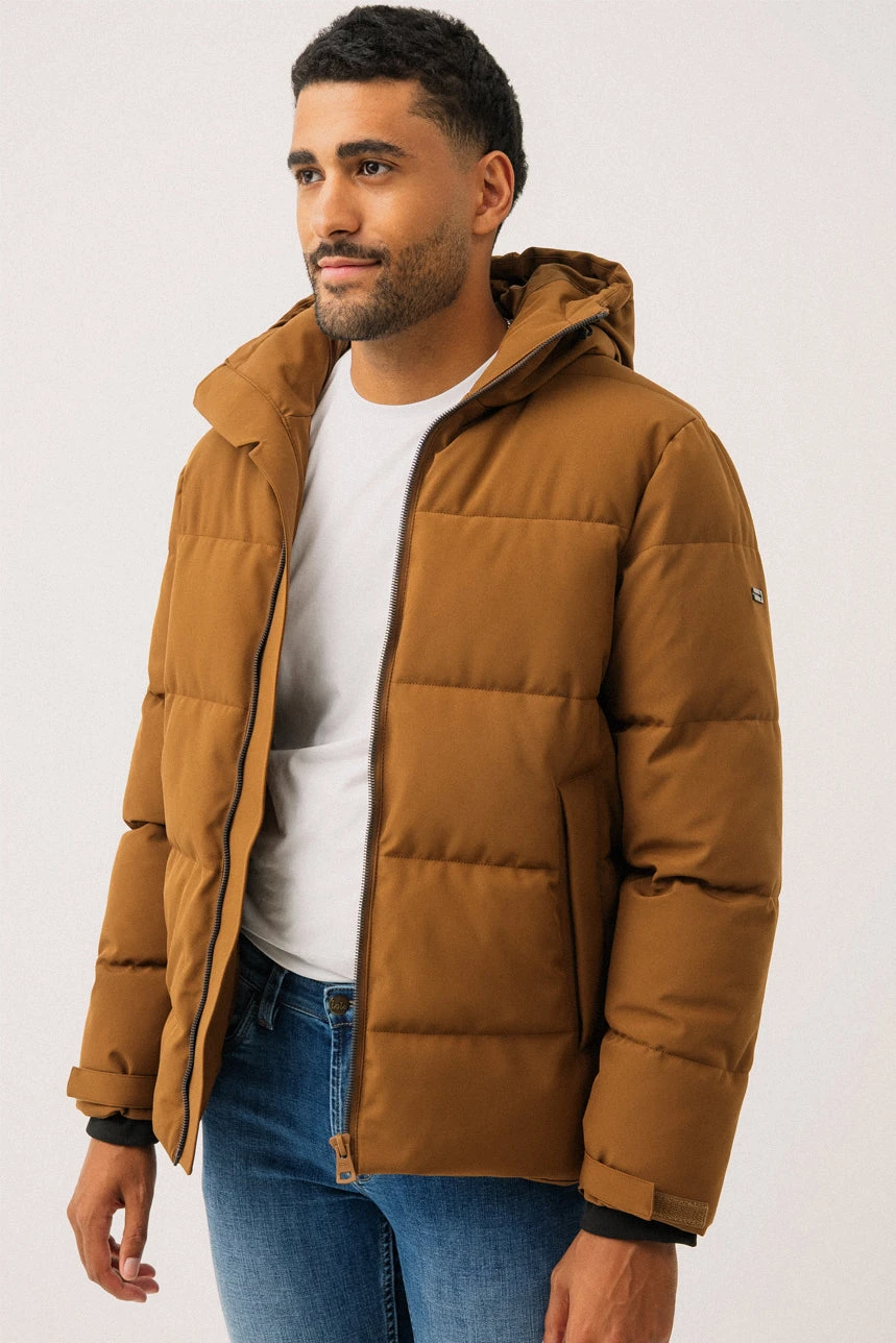 Le manteau matelassé | Modèle Scott présente une coupe droite offrant confort et liberté de mouvement. Il est doté de manches longues avec doubles poignets et ajustement à velcros pour une protection optimale contre le froid. Sa capuche ajustable avec cordons élastiques assure un maintien personnalisable. La fermeture éclair robuste est munie d’un revers coupe-vent intérieur pour bloquer l’air froid. À l’avant, on retrouve deux poches en angle munies d’un système de fermeture élastique dissimulé, ainsi que deux poches intérieures pour un rangement pratique. À l’intérieur, deux ganses utilitaires permettent de porter le manteau sur les épaules lorsque la température se réchauffe. Un modèle alliant fonctionnalité, chaleur et style urbain.