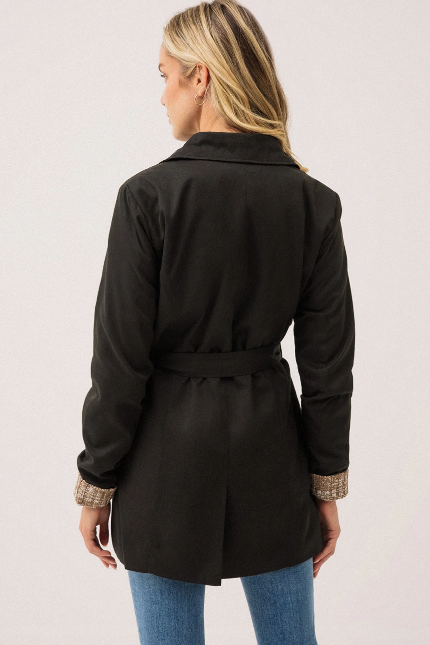 Sa ceinture en tissu à nouer, fixée par deux passants latéraux, permet d’ajuster la taille selon l’envie. La boutonnière double à six boutons (en deux rangées de trois) complète son look classique. Au dos, un pli d’aisance à l’ourlet (6 ½ pouces) assure confort et fluidité des mouvements, tandis que le bavolet à l’épaule droite ajoute une note d’élégance militaire. Le manteau est entièrement doublé pour plus de confort, avec un ourlet droit qui tombe sous le genou pour une finition nette et sophistiquée.