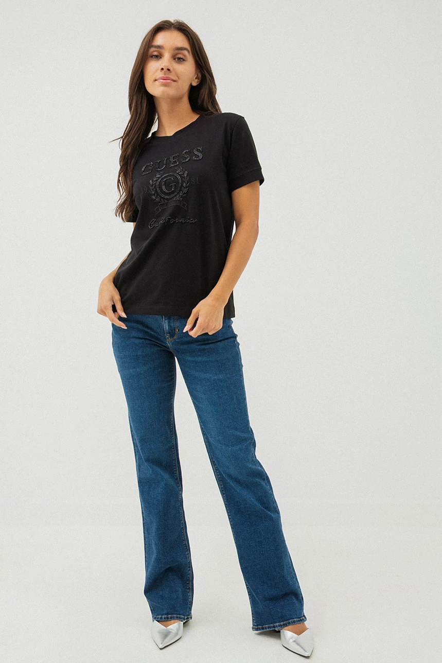 Le t-shirt Guess avec motif perlé adopte une coupe “Boxy” moderne qui lui confère un style décontracté et tendance. Il est doté d’un col rond classique et de manches courtes, parfaites pour un look estival ou superposé. Son design se distingue par une broderie raffinée agrémentée de perles décoratives, apportant une touche élégante et féminine. Confectionné dans une matière douce et confortable, il allie aisément style et bien-être au quotidien.