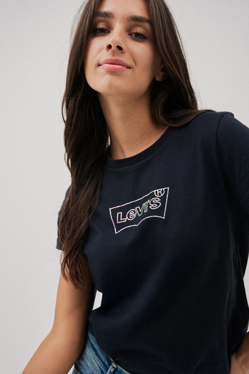 Le t-shirt noir Levi’s avec logo en strass combine simplicité et éclat. Sa coupe ajustée et son col rond classique offrent un tombé flatteur, tandis que le logo orné de strass à l’avant apporte une touche de brillance subtile. Conçu dans une matière confortable, il se porte facilement au quotidien, seul ou sous une veste pour un look casual-chic.