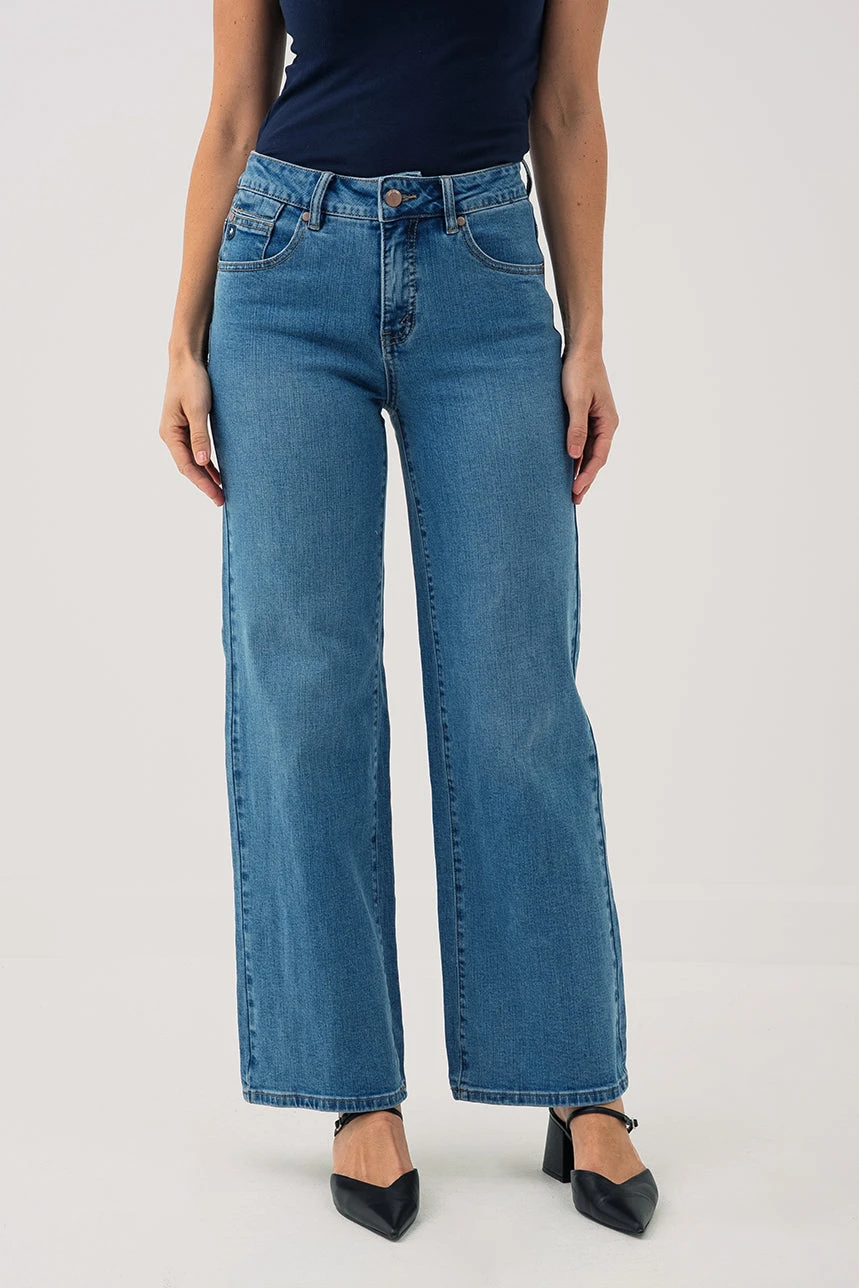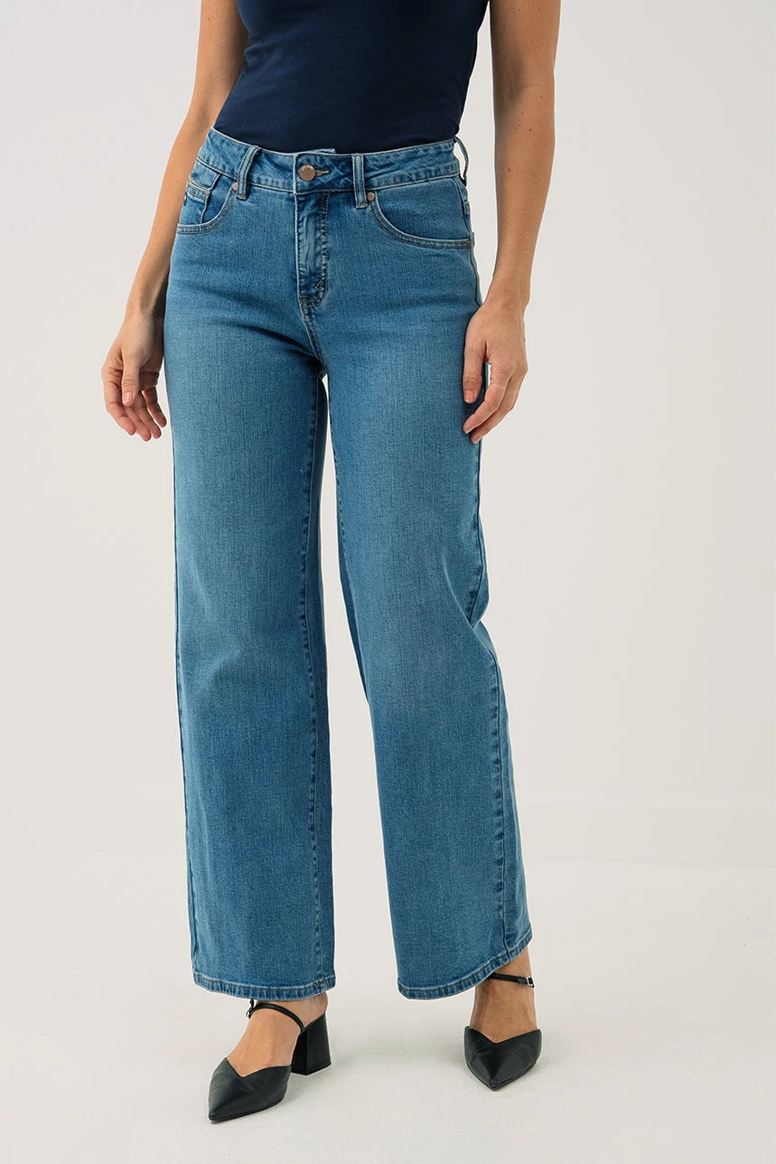 Le jeans bleu moyen Modèle Luna Wide présente une taille haute ajustée qui met la silhouette en valeur tout en offrant un maintien confortable. Sa jambe large lui confère un style moderne et décontracté, idéal pour le quotidien. Conçu dans un denim doux et extensible, il garantit une liberté de mouvement optimale. Avec sa coupe 5 poches, sa fermeture éclair et son bouton à l’avant, il allie fonctionnalité et allure contemporaine.