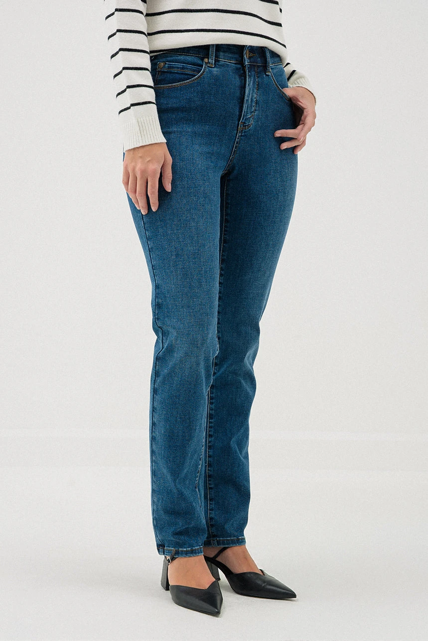 Le jeans droit classique | Modèle New GIGI allie confort et élégance intemporelle grâce à sa coupe droite et sa taille régulière. Conçu avec une doublure intérieure qui retient le ventre et une bande élastique intégrée à la taille, il offre un maintien optimal et une silhouette flatteuse. Avec sa coupe 5 poches pratique et sa longueur de jambe de 31 pouces, ce modèle se porte facilement au quotidien et constitue une pièce essentielle pour un style classique et polyvalent.