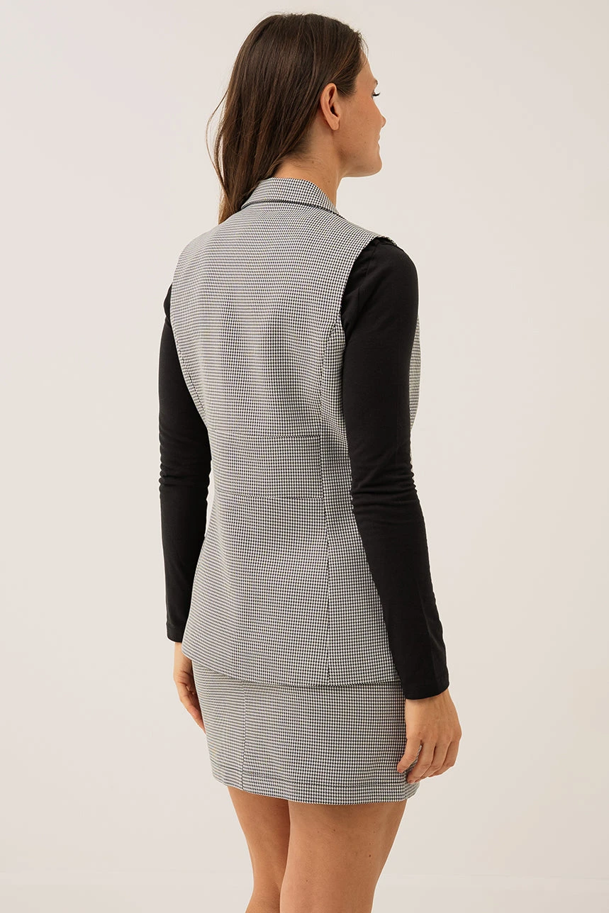La veste habillée pied de poule noire présente une coupe près du corps qui met en valeur la silhouette. Elle est dotée d’un col cranté élégant et de deux poches passepoilées à l’avant, tandis que son ourlet droit et sa longueur sous la taille lui confèrent un style soigné et structuré. Conçue pour se porter ouverte, cette veste combine sophistication et confort pour un look chic et moderne.
