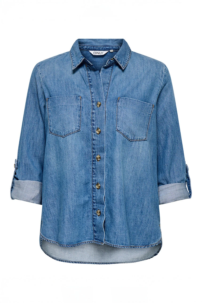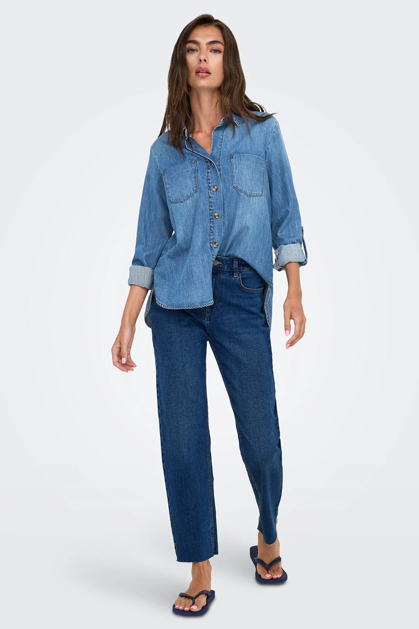 La chemise en denim bleu moyen par Only présente une coupe droite confortable, agrémentée d’un col chemisier et d’une encolure en V. Elle dispose d’une boutonnière pleine longueur, de deux poches appliquées à la poitrine, ainsi que de manches longues roulables avec poignets munis de fentes et boutons. Son ourlet arrondi, plus long à l’arrière, et son denim léger et agréable au toucher en font une pièce à la fois pratique et stylée, idéale pour un look décontracté mais soigné.