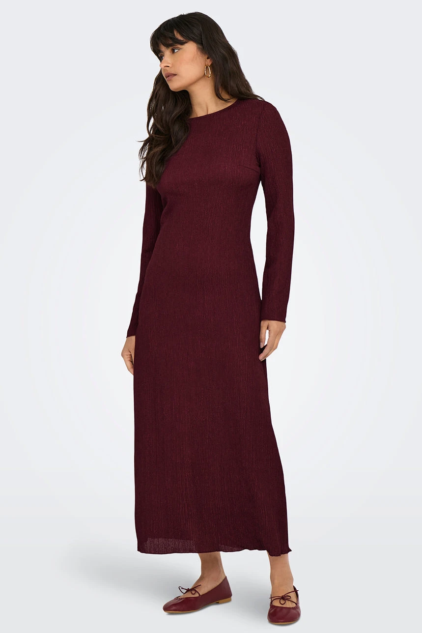 La robe maxi bordeaux à manches longues par Only est une pièce fluide et élégante, conçue avec une coupe légèrement ajustée qui souligne subtilement la silhouette. Dotée d’un col rond classique et de manches longues, elle se distingue par ses finitions au point foulard qui apportent une touche raffinée. Sa longueur maxi et sa matière texturée et fluide garantissent un tombé gracieux et un confort optimal tout au long de la journée.