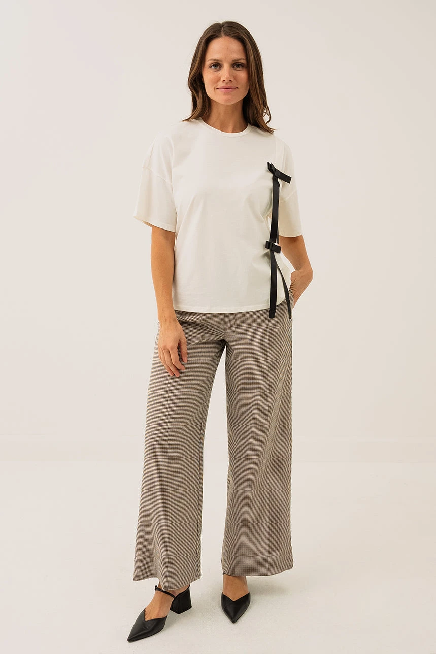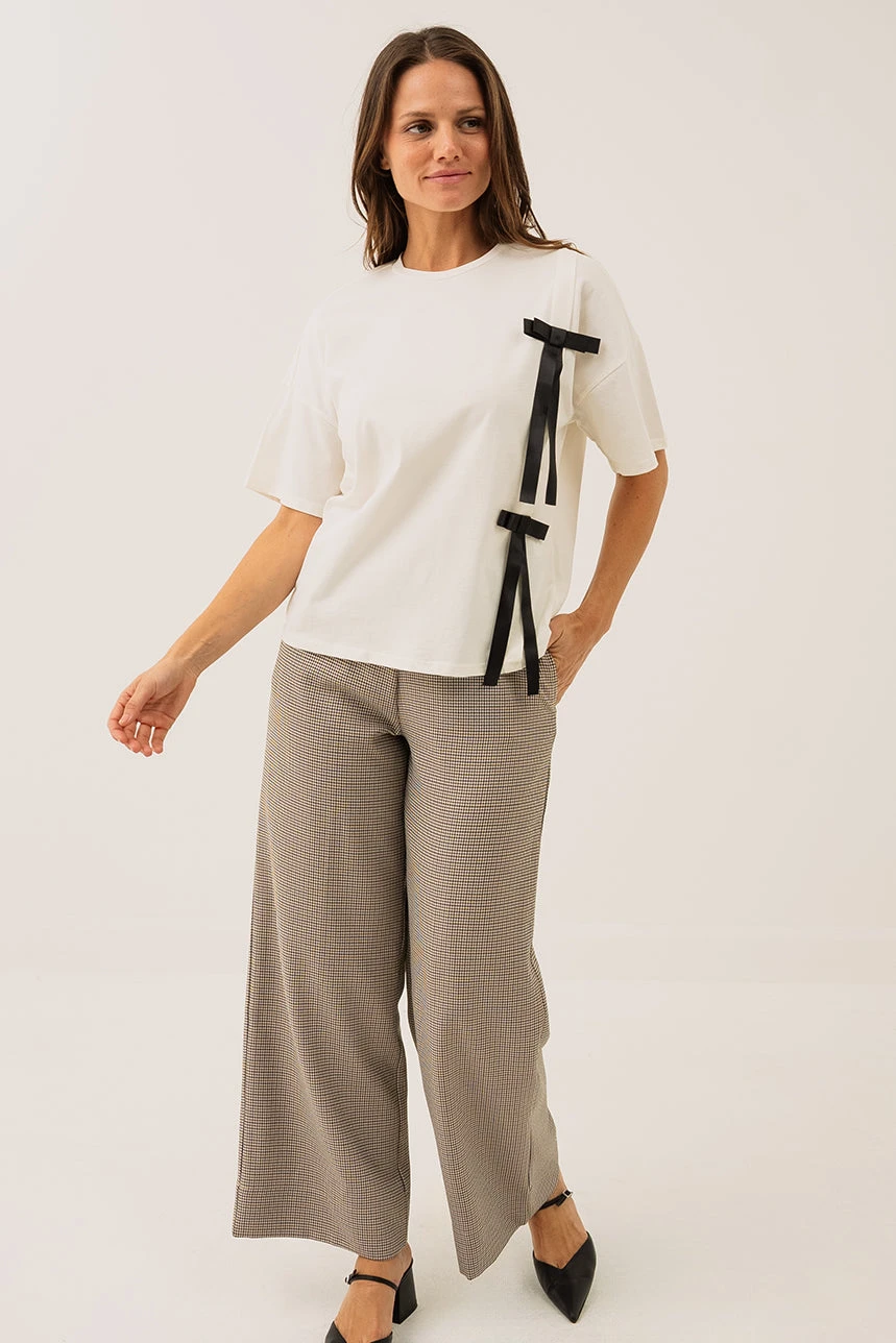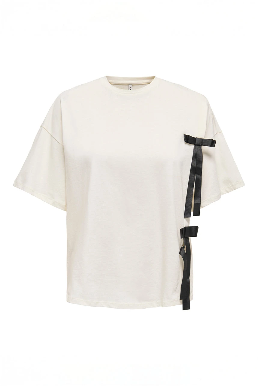 Le t-shirt blanc avec boucles noires présente une coupe Boxy Boyfriend, offrant un style légèrement oversize et masculin pour un look décontracté et moderne. Il est doté d’un col rond avec finition en rib pour un confort optimal au niveau de l’encolure, et de manches courtes aux épaules tombantes qui ajoutent du volume et de l’aisance au vêtement. Deux boucles appliquées à l’avant, du côté gauche, apportent un détail décoratif original et subtil. Confectionné dans une matière douce et extensible, ce t-shirt combine confort et style, parfait pour compléter une tenue casual avec une touche distinctive.