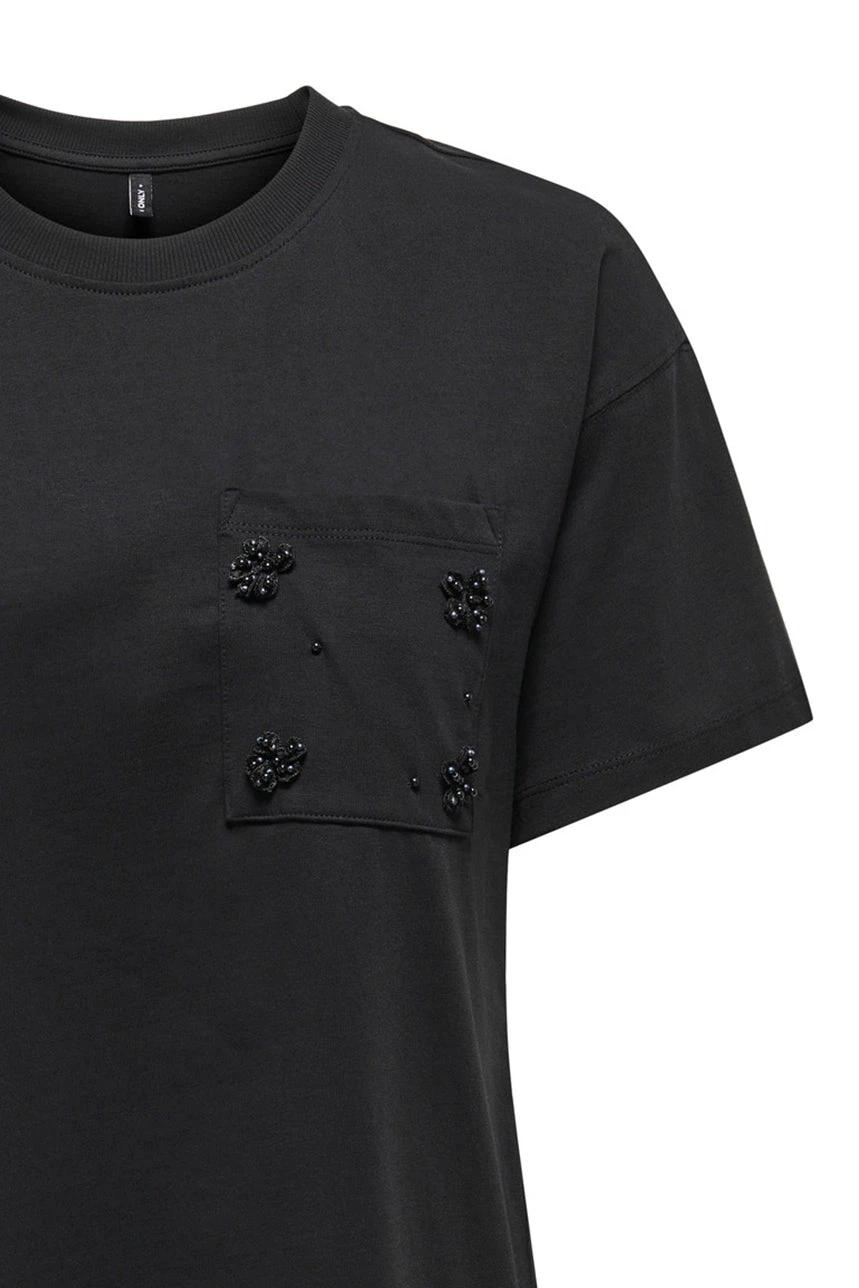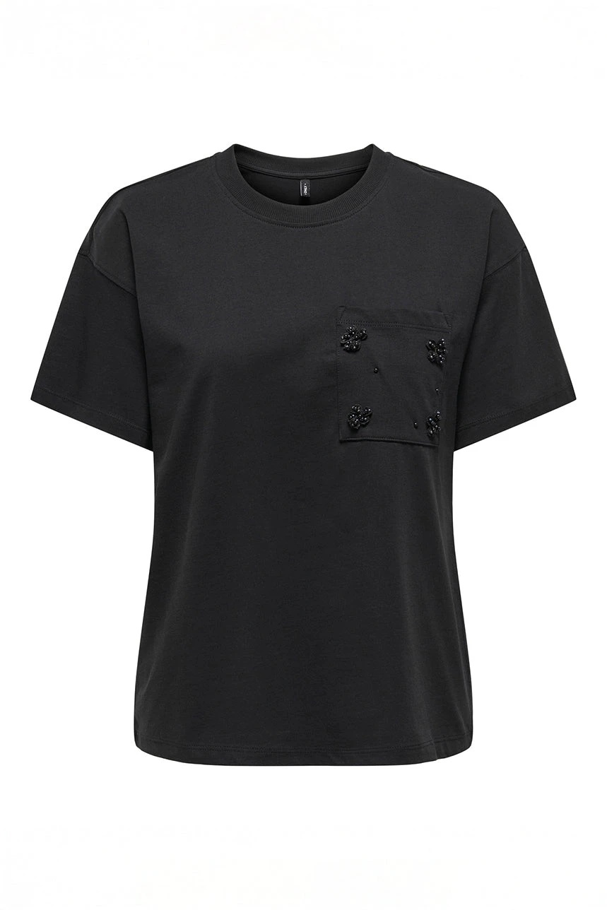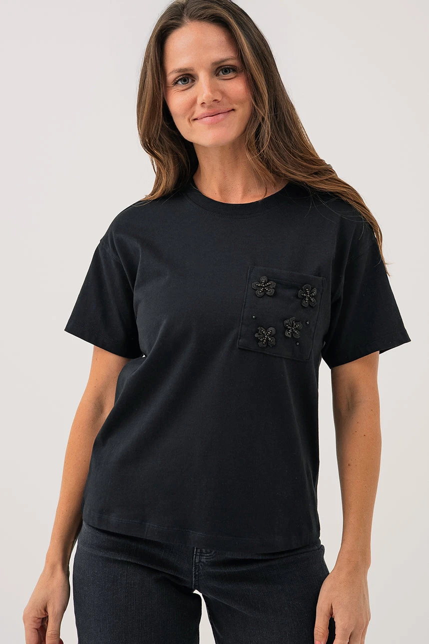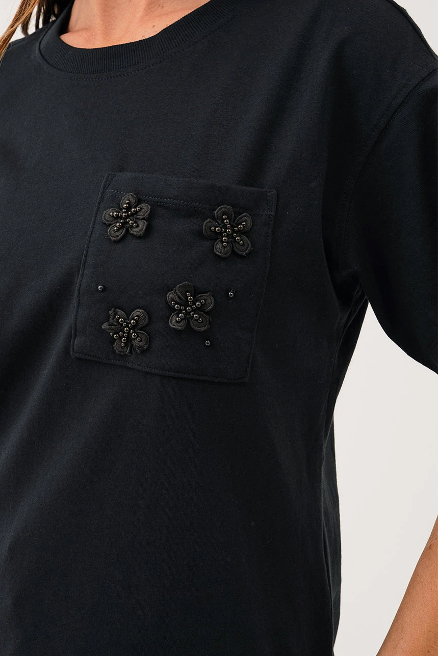 Le t-shirt noir avec poche perlée se distingue par sa coupe droite ample, offrant un confort optimal et un style décontracté. Il présente un col rond avec finition en rib et des manches courtes, parfait pour un porté facile au quotidien. Une poche appliquée sur le côté gauche de la poitrine est décorée d’une broderie florale agrémentée de perlage, apportant une touche féminine et raffinée au vêtement. Confectionné dans une matière douce et extensible, ce t-shirt allie confort, praticité et détails élégants pour un look à la fois simple et travaillé.
