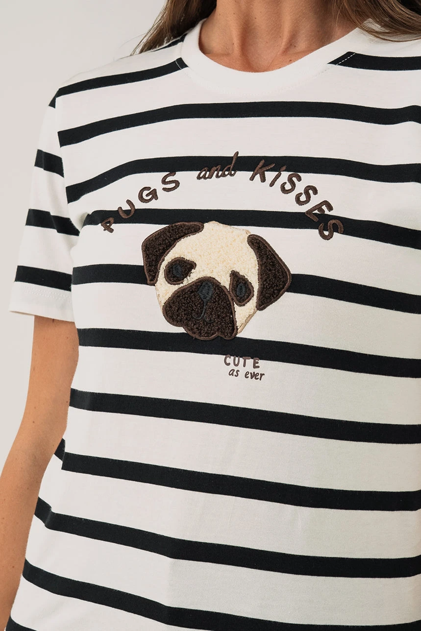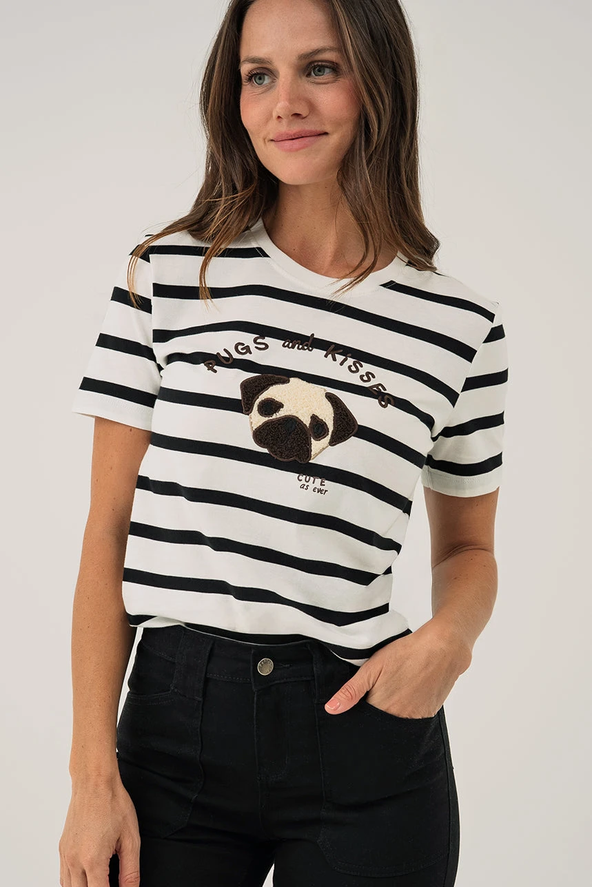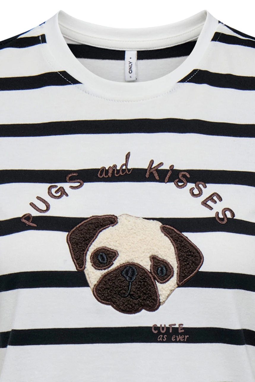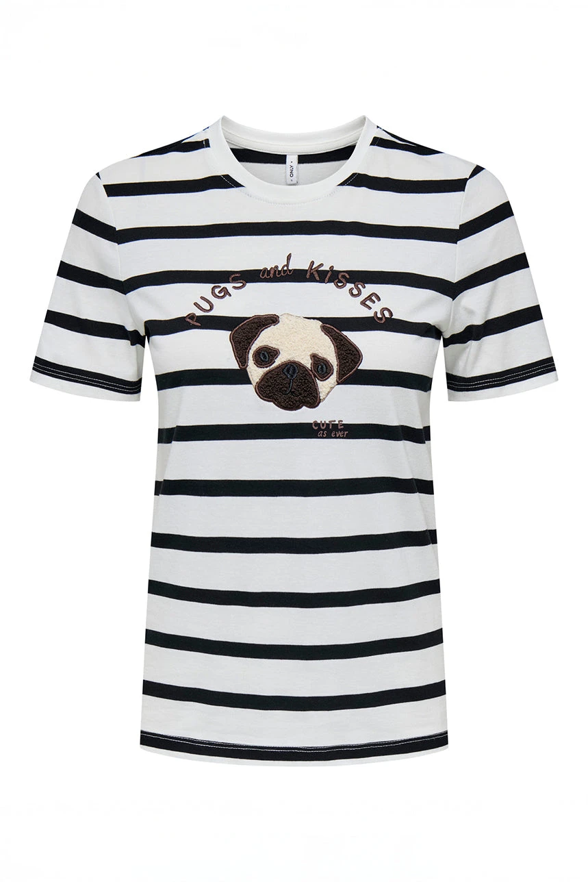 Le t-shirt rayé blanc et noir avec broderie de chien par Only est une pièce casual qui allie confort et style. Il présente une coupe régulière droite, offrant un tombé élégant et facile à porter sur différentes silhouettes. Le col rond, agrémenté d’une finition en rib, assure un maintien agréable tout en ajoutant une touche classique, tandis que les manches courtes offrent liberté de mouvement et confort.