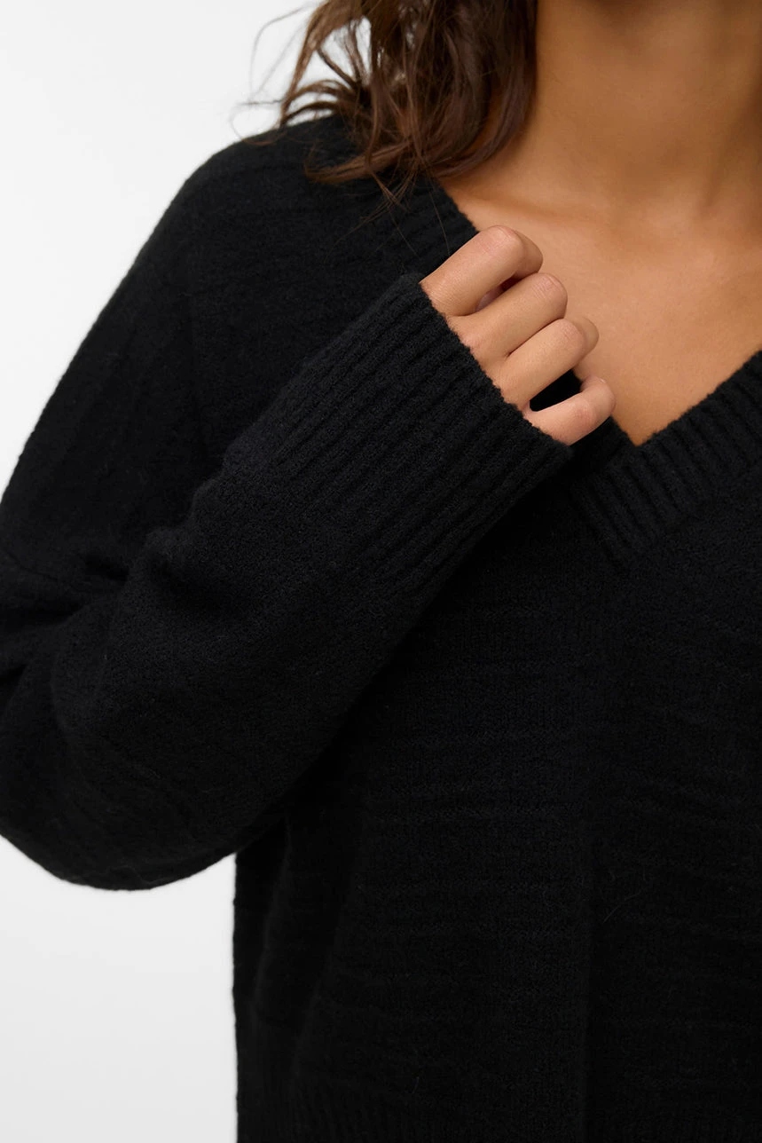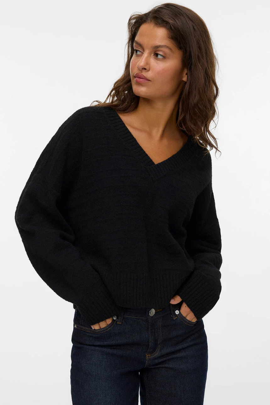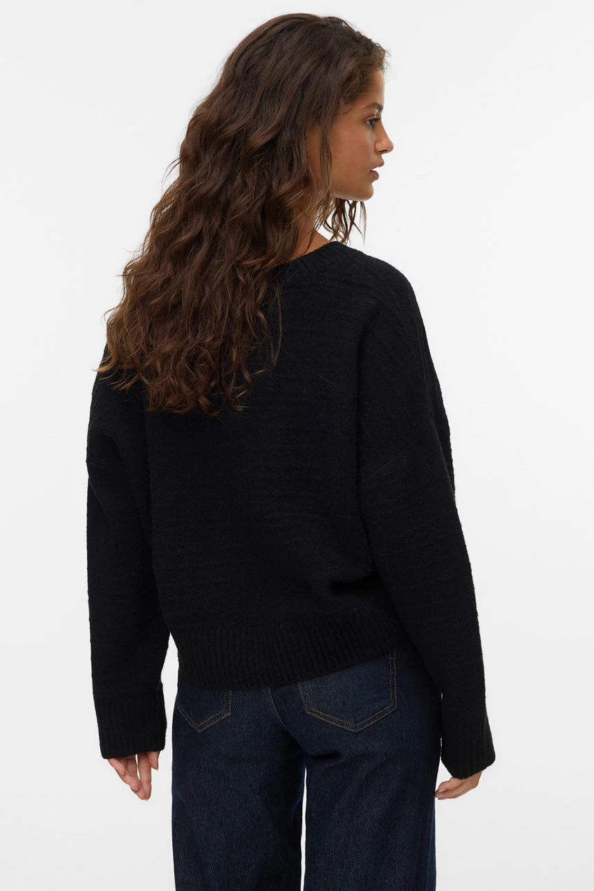 Le chandail en tricot noir à col en V par Vero Moda présente une coupe ample qui offre confort et liberté de mouvement. Son col en V apporte une touche élégante et légèrement féminine, tandis que les manches longues et l’ourlet droit assurent un style classique et polyvalent. Les bordures côtelées et le tricot doux et extensible garantissent une finition soignée et un confort optimal, faisant de ce chandail un essentiel facile à intégrer dans diverses tenues, qu’elles soient décontractées ou plus habillées.